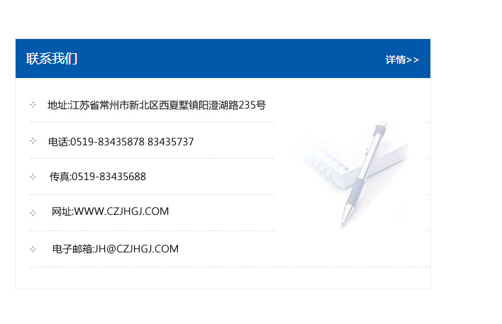 傳真:0519-83435688    郵編:213135    網址:WWW.czjhgj_com.chinaxxhb.com    電子郵箱:JH@czjhgj_com.chinaxxhb.com